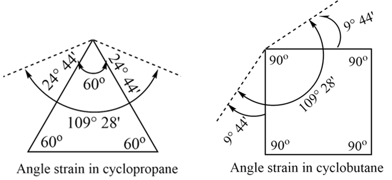 The angle strain in cyclopropane and cyclobutane is shown as below: