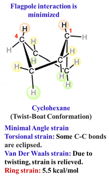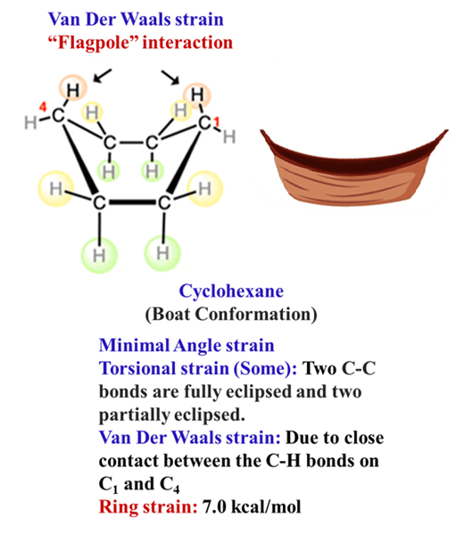 - Torsional Strain: The bonds along the “sides” of the boat are eclipsed.