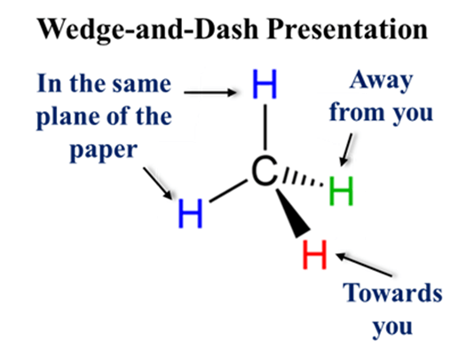 - Solid Wedge: The bond is coming toward you (out of the page).