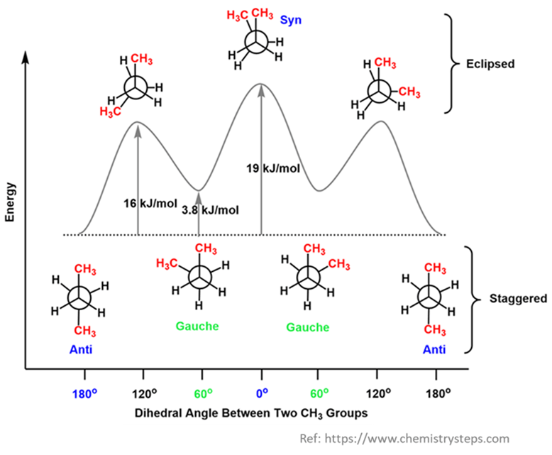 The Methyl groups are staggered but close to each other (60° apart). Even though they are staggered, the bulky CH3 groups are close enough that their electron clouds start to repel. This is called Steric Strain (or Van der Waals strain). Stable, but slightly “uncomfortable” due to proximity.
