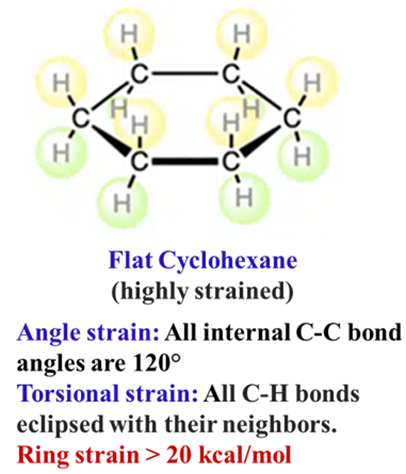 - The Stress: As we learned with Ethane, eclipsing bonds create massive repulsion between electron clouds. In a flat cyclohexane, this repulsion would happen at all six carbon-carbon bonds simultaneously.