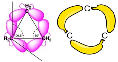 - The Conflict: In cyclopropane, the carbons form an equilateral triangle with 600 angles. However, sp3 orbitals naturally want to be at 109.50.