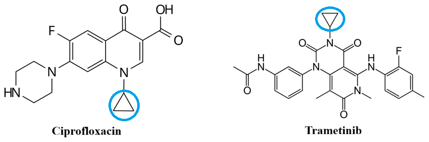 Examples of drugs that utilize the cyclopropane moiety include the antibiotic Ciprofloxacin and the anticancer agent Trametinib, where the ring contributes to high potency and improved properties.