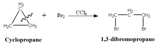 Example: Normal alkanes (like propane) don’t react with Br2 in the dark. However, cyclopropane undergoes a “ring-opening” reaction with Br2 in dark and form addition product 1,3-dibromopropane.