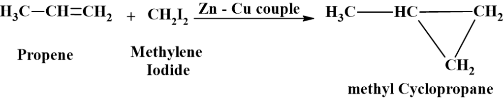 Alkenes react with methylene iodide (CH2I2) in presence of Zn-Cu couple to form cyclopropane derivatives.