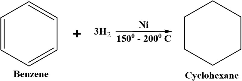 Benzene and its derivatives can be catalytically hydrogenated by passing hydrogen gas and using Ni catalyst at high temperature (150-200oC) to produce cyclohexane and substituted cyclohexanes.