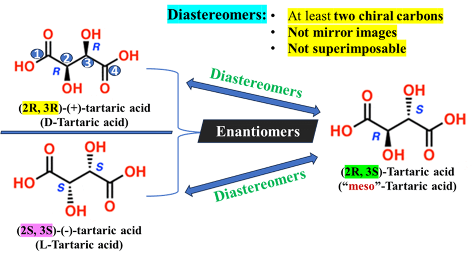 Tartaric Acid is the classic textbook example because it perfectly illustrates how diastereoisomers and enantiomers coexist within the same set of molecules. Tartaric acid has two chiral centers. According to the 2n rule, we expect 4 isomers (22 = 4) due to presence of 2 chiral carbons, but there are actually only 3 because one form is a Meso compound.