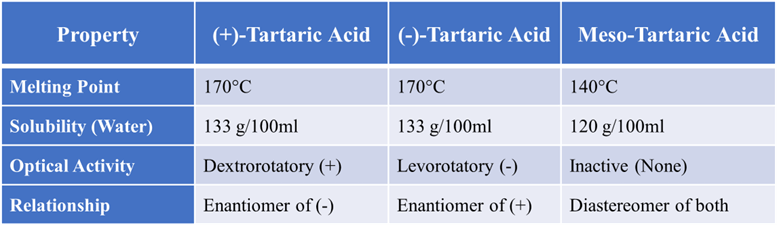 Meso-Tartaric Acid: This version has an internal plane of symmetry (the top half is a mirror image of the bottom half). Even though it has chiral centers, the top half “cancels out” the bottom half, making the whole molecule achiral (optically inactive).
