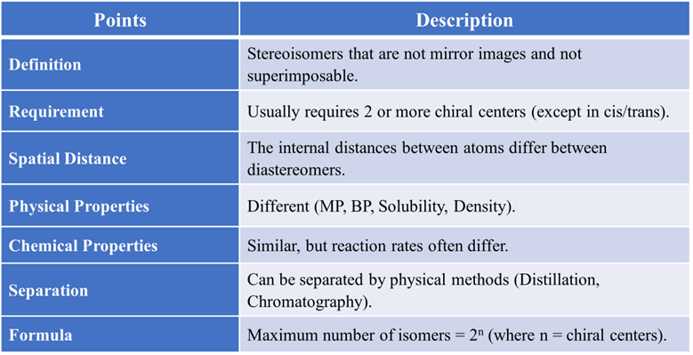 Diastereoisomerism isn’t limited to chiral centers; it also includes Cis-Trans (Geometric) Isomerism (like those found in alkenes). They have the same connectivity but are not mirror images of each other.