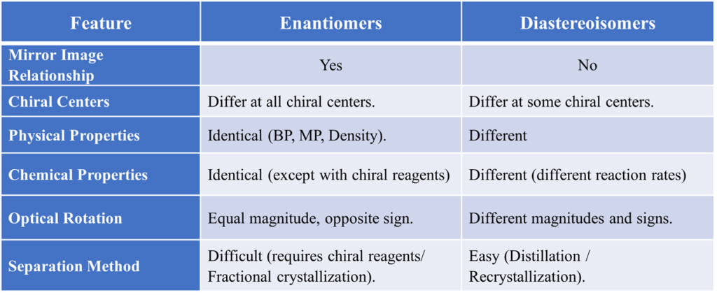 • Chemical Reactivity: They react with the same reagents but often at different speeds because their shapes fit differently into reaction sites.