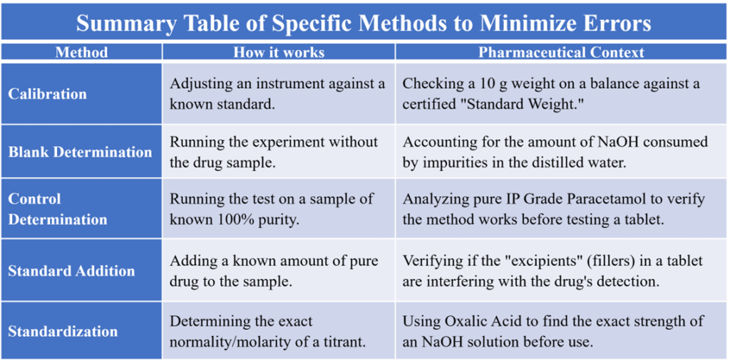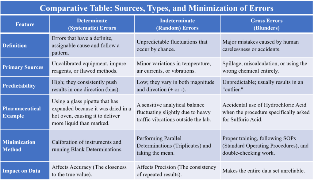 An error is the difference between the measured value and the “true” or accepted value. Even with the best equipment, some error is always present. In pharmaceutical analysis, errors can significantly impact the safety and efficacy of a drug. While errors can never be zero, they must be within the Official Limits set by the Indian Pharmacopoeia (IP).
