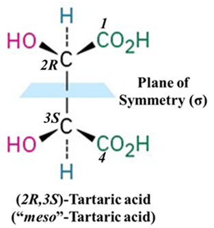 This is the classic, most frequently cited example. It is the poster child for meso compounds. It has two chiral centers (C2 and C3). There is a plane of symmetry dividing the molecule into two mirror-image halves (HOOC−𝐶𝐻(𝑂𝐻) on top and 𝐶𝐻(𝑂𝐻)−𝐶𝑂𝑂𝐻 on bottom). The top half is (𝑅) and the bottom half is (S), resulting in internal compensation (no net rotation). Hence optically inactive.