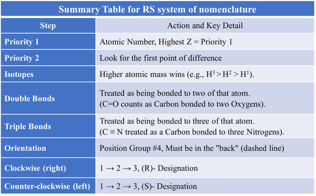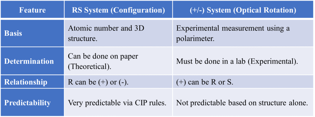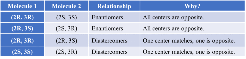 Summary Table: Identifying Relationships via RS: This table is a “cheat sheet” for exams. If you know the RS configuration of two molecules, you can instantly tell their relationship without drawing them.