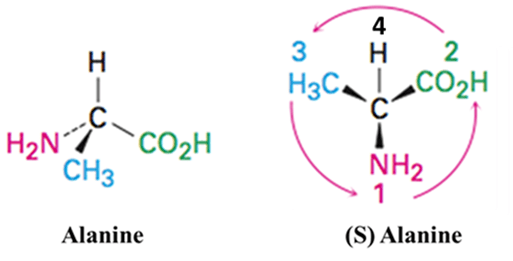 The amino acid Alanine with a chiral center attached to different groups is priorities as below: