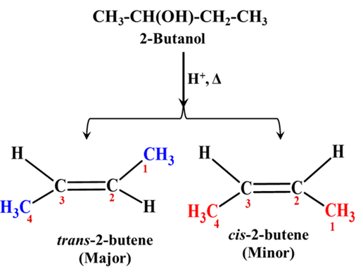 Let’s look at the dehydration of 2-butanol. When we heat 2-butanol with an acid catalyst (like H2SO4), it can form two different stereoisomers of 2-butene: cis-2-butene and trans-2-butene.